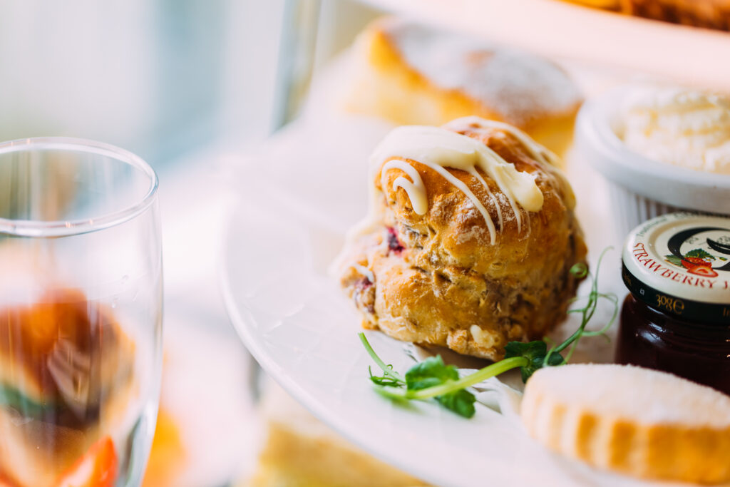 Warm oven-baked scones served with real Irish butter, homemade preserves and fresh cream